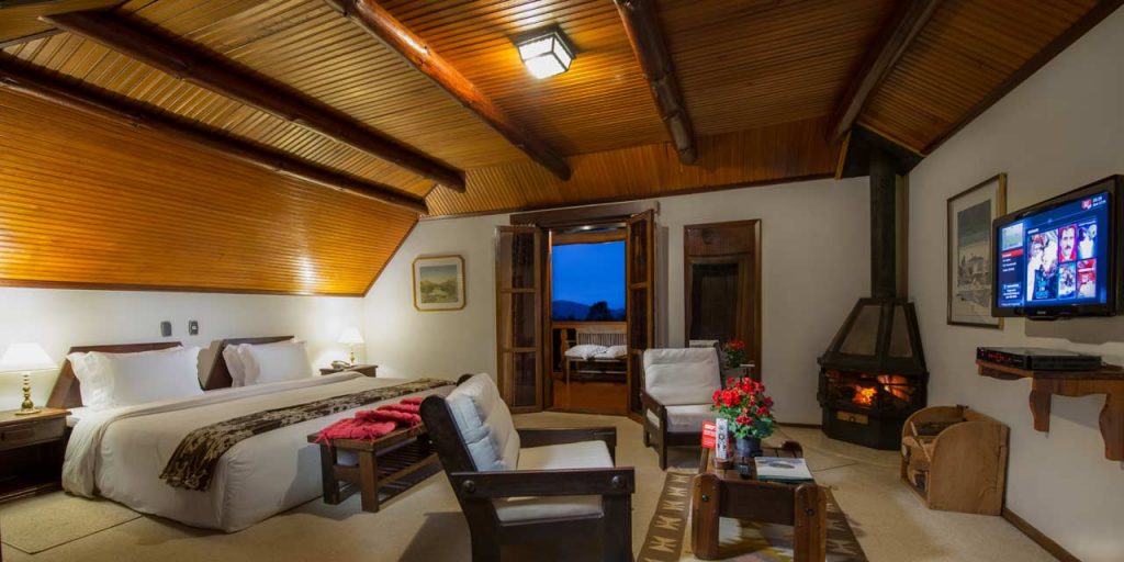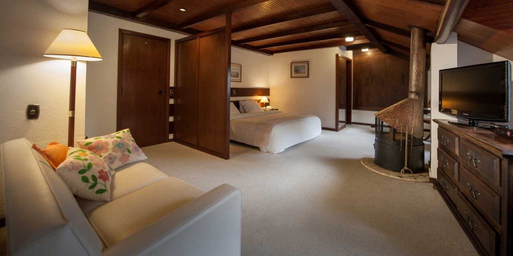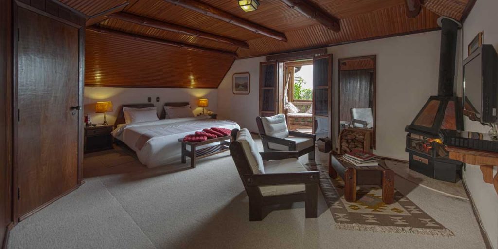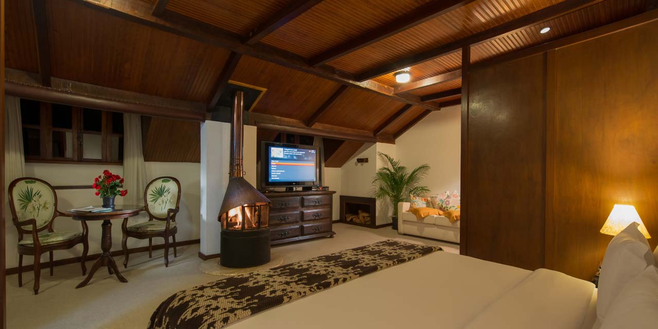 Espaçosas, com cama king size e vista para o jardim da sede, a Suite Junior está equipada com TV aberta e a cabo com sinal HD, lareira, frigobar, cofre, banheiro com secador de cabelos, roupões, espelho amplificador e “amenities”.