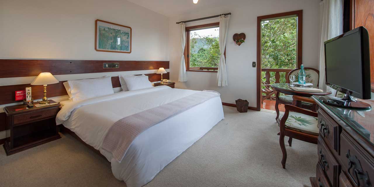 Os aconchegantes apartamentos do“tipo superior” da sede possuem cama king size, varanda com vista para as montanhas, TV com sinal SKY HD, cofre, banheiro com roupões, secador de cabelo, espelho amplificador e “amenities”.