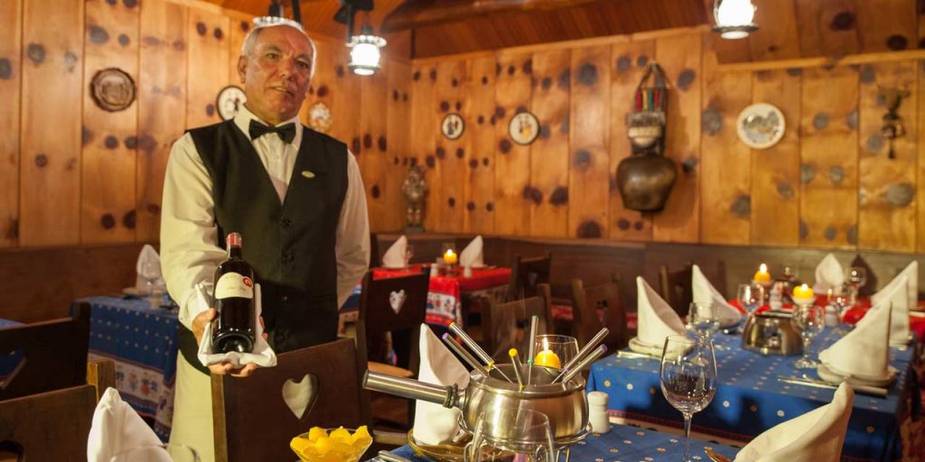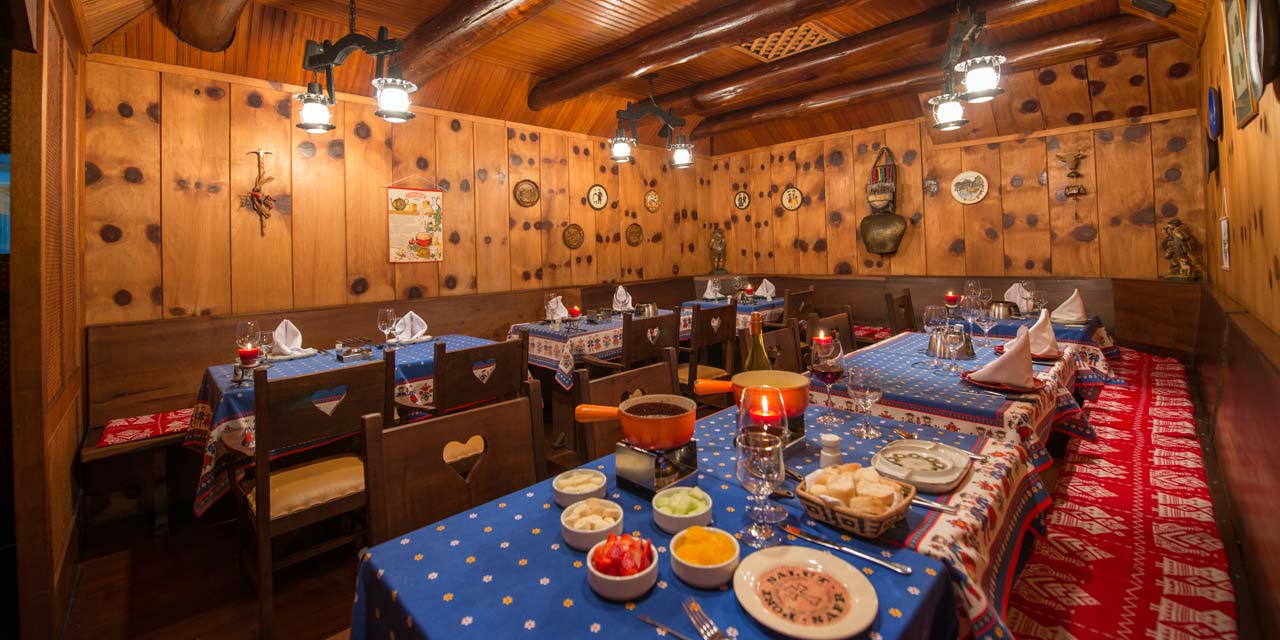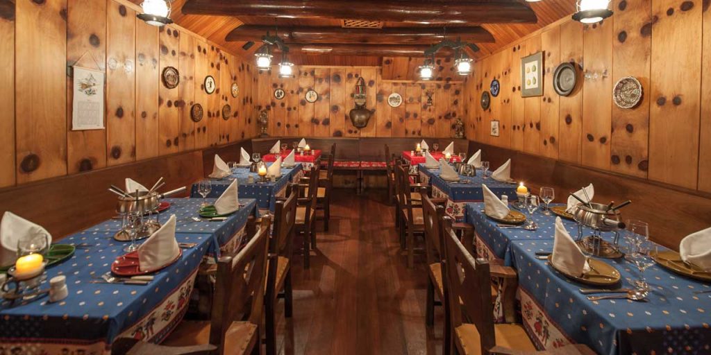 Stube, o cantinho aconchegante e aquecido da casa alpina onde a família se reunia para suas refeições. Nele são servidos foundues “bourguignon” e “chinoise” de carne, o “savoyard”de queijo e de chocolate (reservar na recepção).